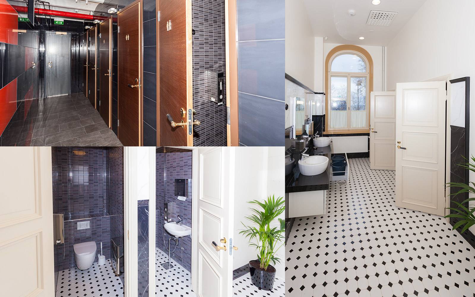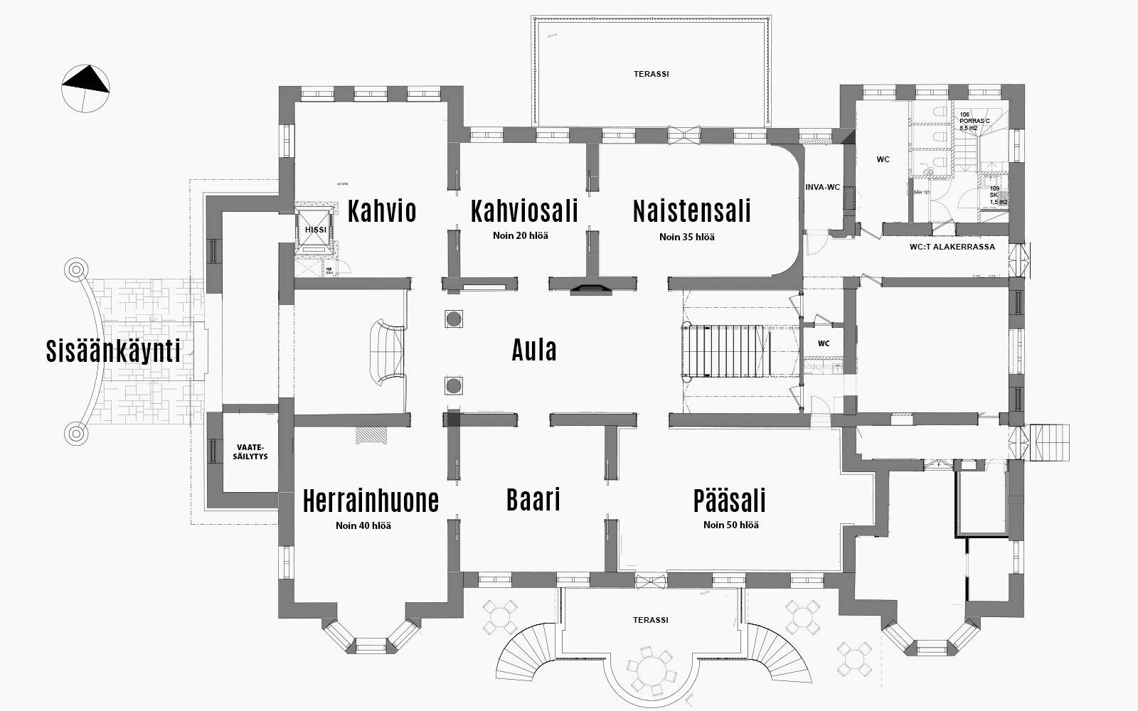 Eteläpuolen kolme salia on yhdistettävissä. Yhdessä ne tarjoavat tilat jopa 100 hengelle. Tarjoilut onnistuvat helposti salien välissä olevasta baarista.