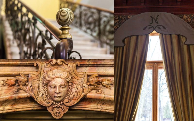 Näsilinnan tilat pitävät sisällään lukuisia upeita ja alkuperäisiksi entisöityjä yksityiskohtia, tapettikuoseja, veistoksia, takkoja sekä erilaisia pintoja.