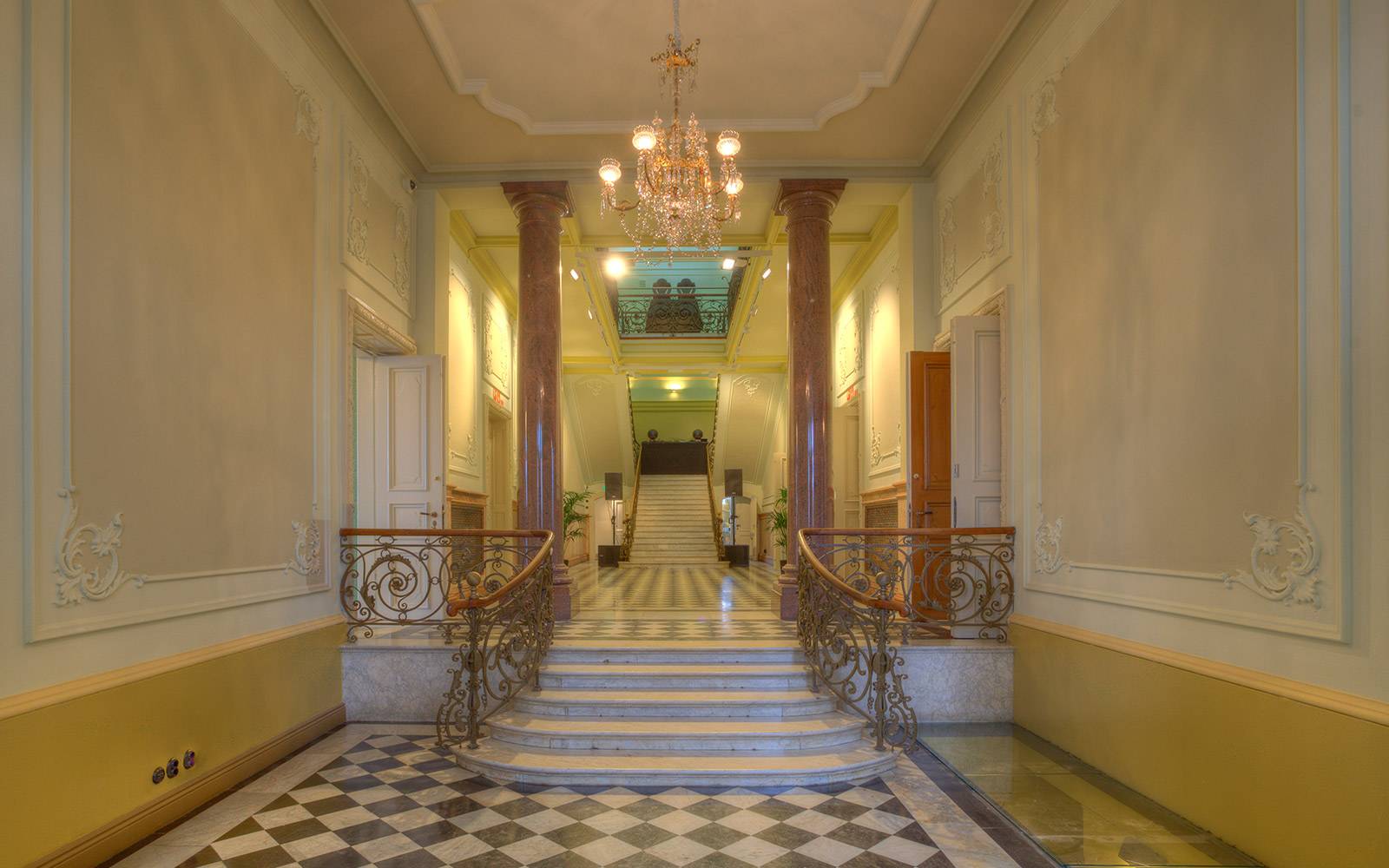 Suuri eteisaula portaikkoineen ja upeine yksityiskohtineen tarjoaa paikan esimerkiksi juhlapuheille ja toimii myös biletilana sekä tanssilattiana.